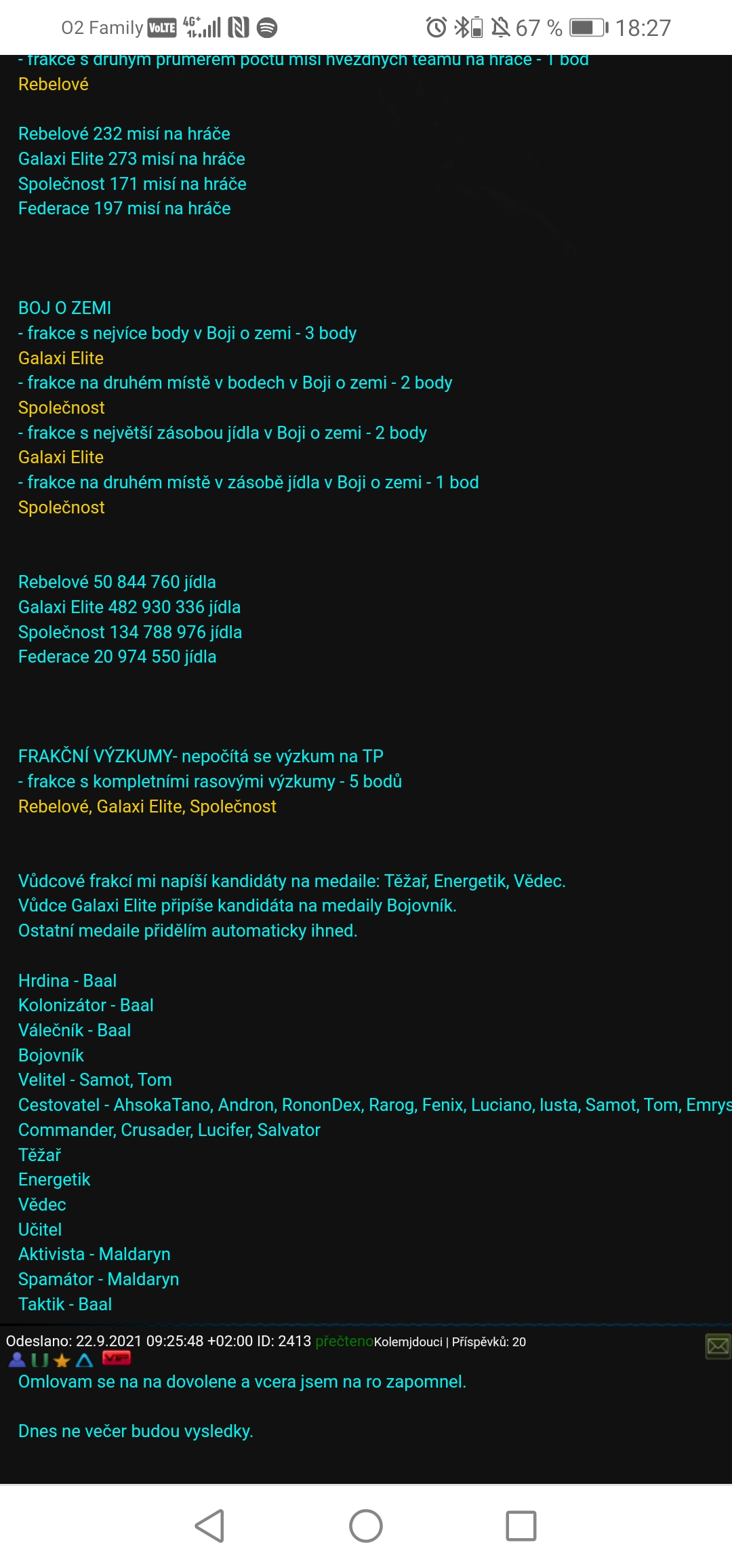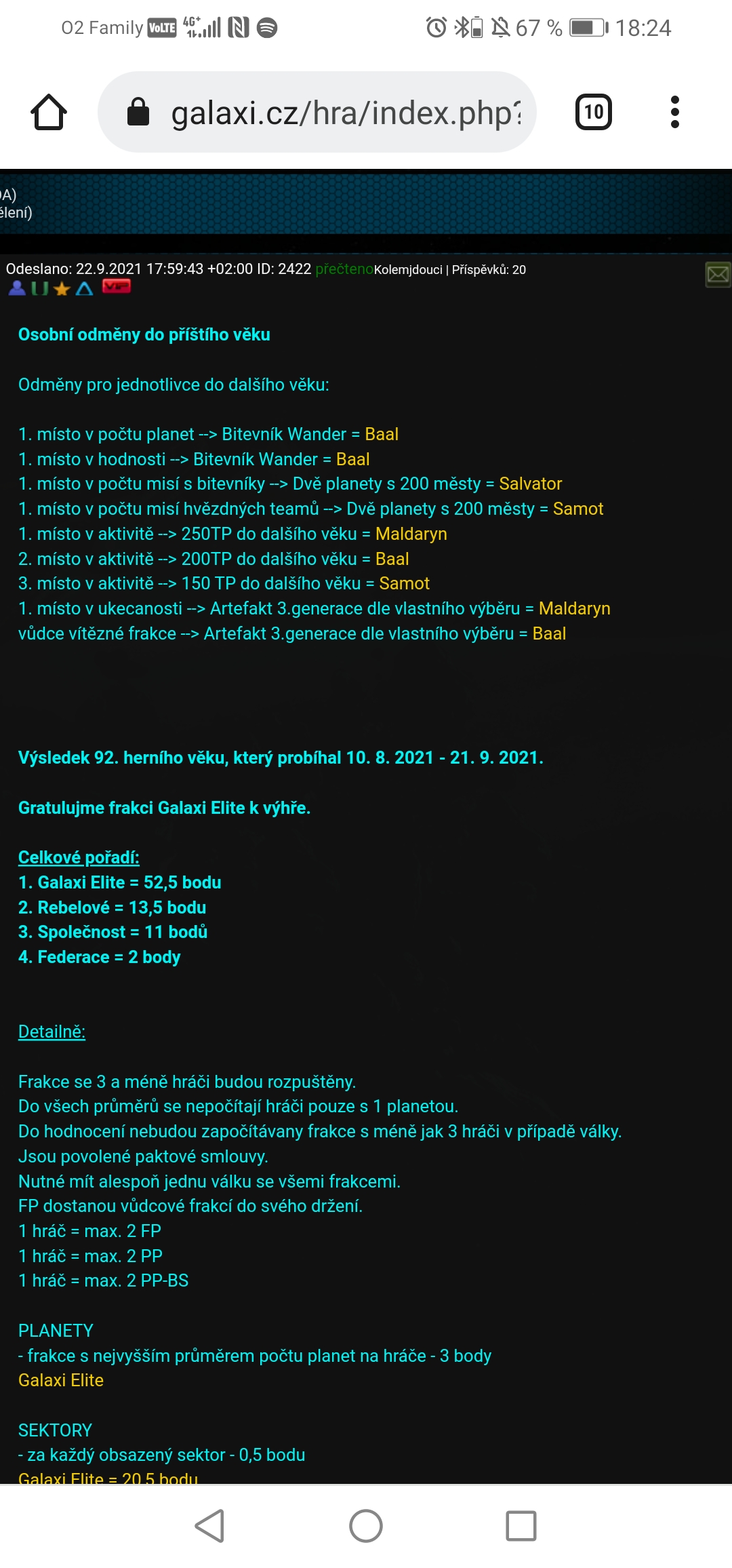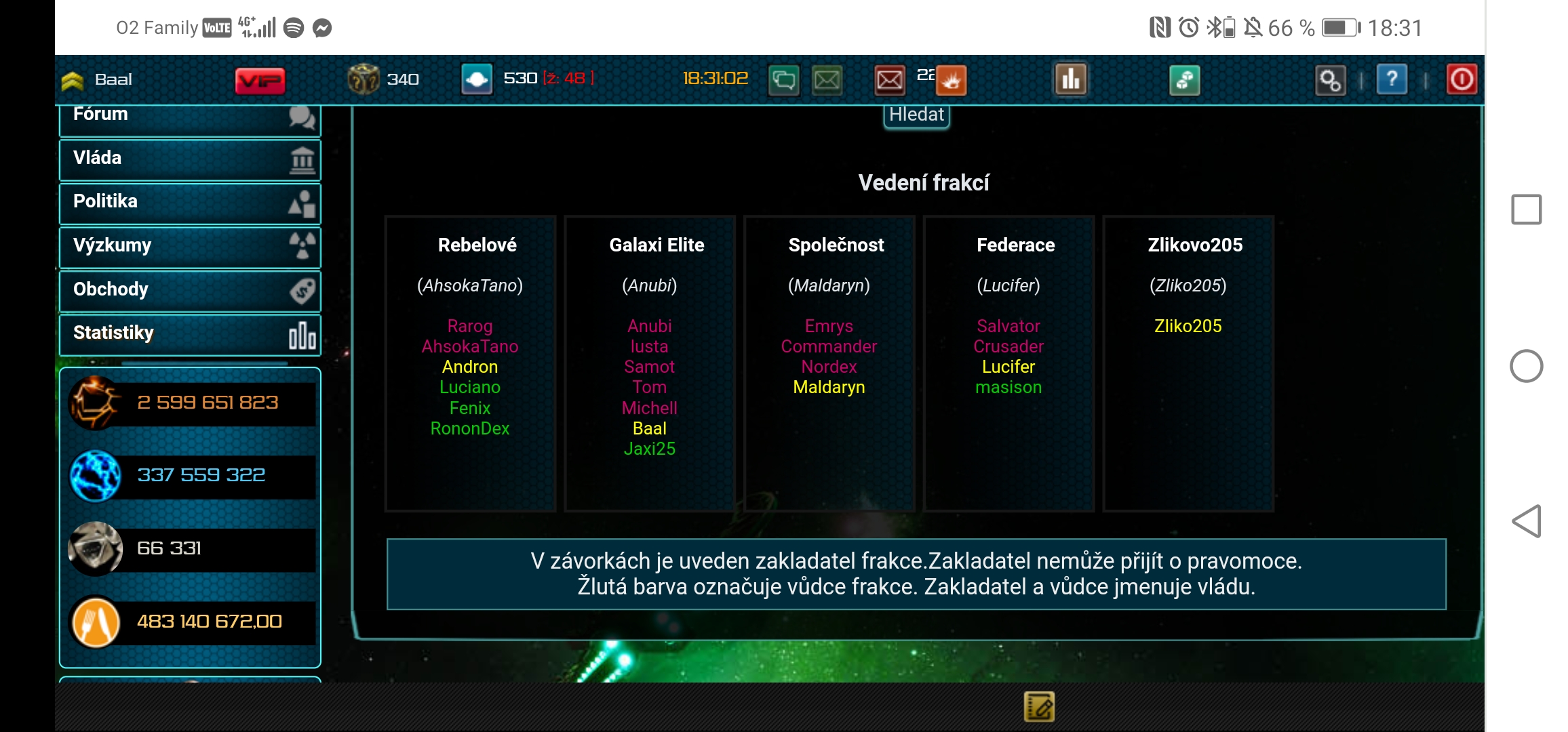 | Galaxi Elite | Společnost | 94:80 | Frakce Galaxi Elite si polepšila o 14 planet. |