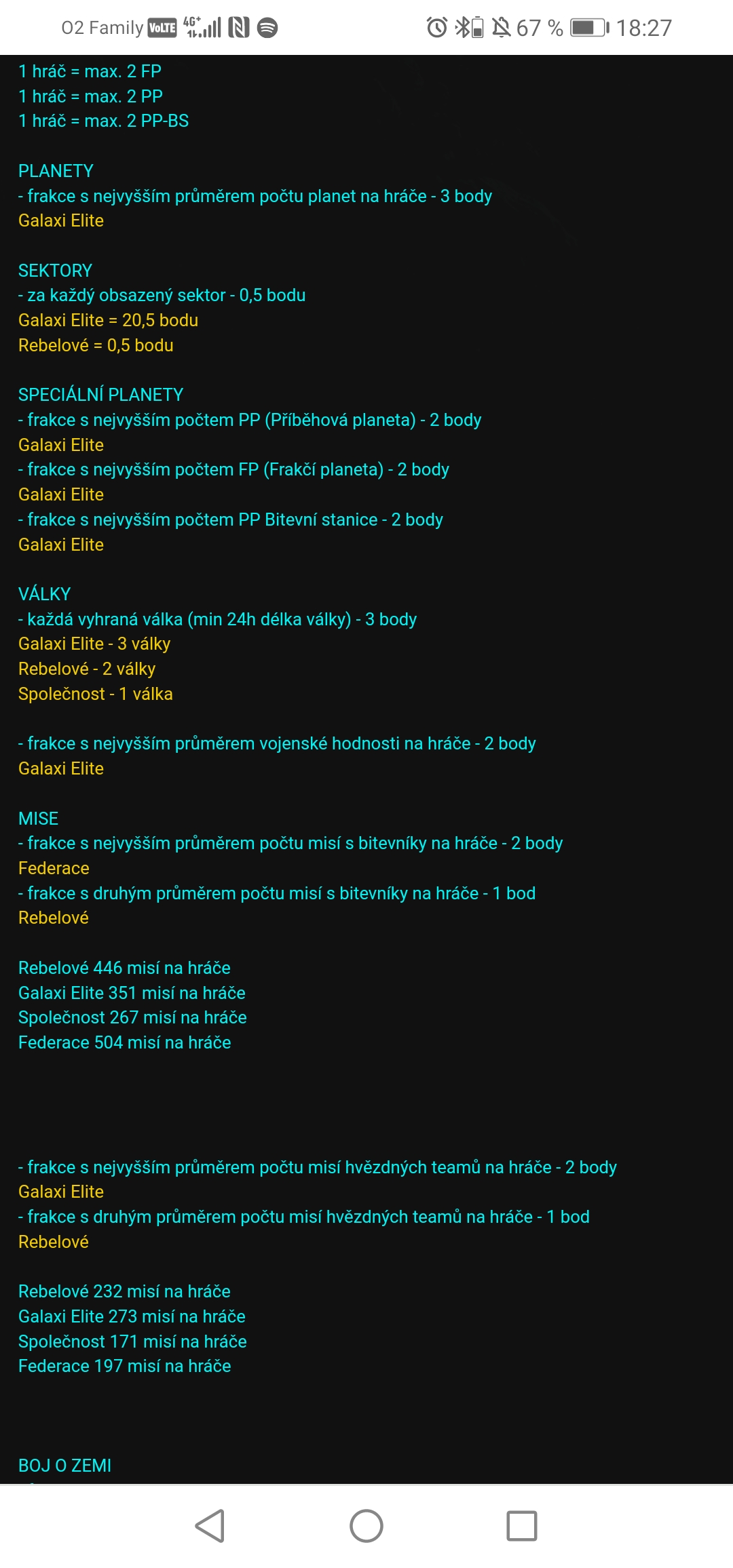 | Galaxi Elite | Rebelové | 260:170 | Frakce Galaxi Elite si polepšila o 90 planet. |