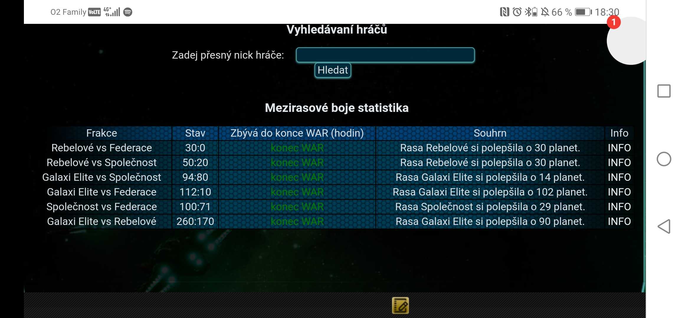 | Galaxi Elite | Federace | 112:10 | Frakce Galaxi Elite si polepšila o 102 planet. |